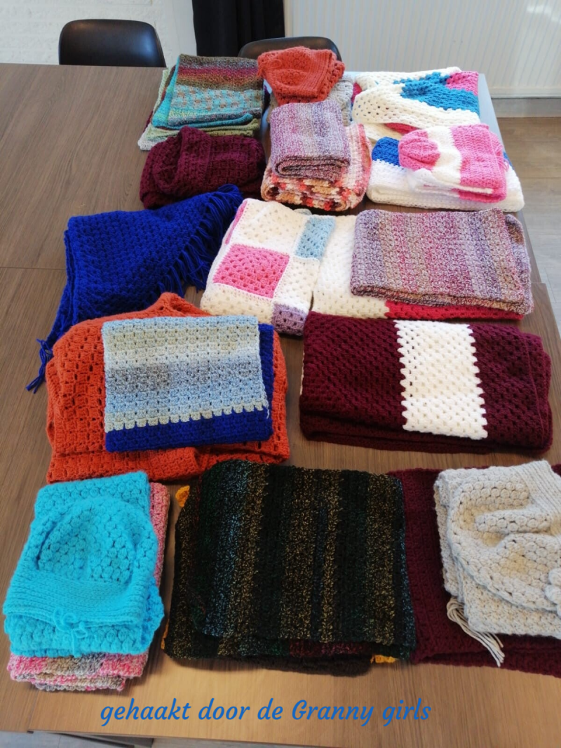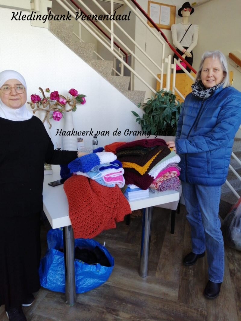 Alweer een donatie van de Haakgroep van Buurthuis De Driehoek. Tassen vol mutsen sjaals en dekentjes hebben "The Granies" gehaakt voor de kledingbank in Veenendaal. Zal wel goed van pas komen gezien de koude weersverwachtingen.