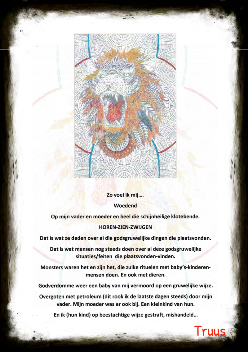 Ik ben sinds mijn babytijd seksueel misbruikt, gemarteld, mishandeld. Mijn familie was een clan. En de gemeenschap deed er in mee. Ik kreeg overal de schuld van en werd als een hoer behandeld en neergezet. Dit heeft tot mijn 30 jaar geduurd.