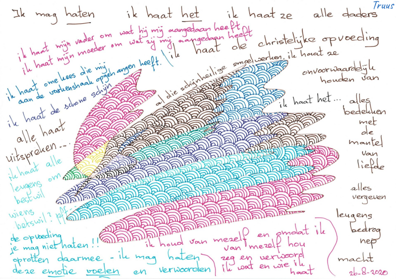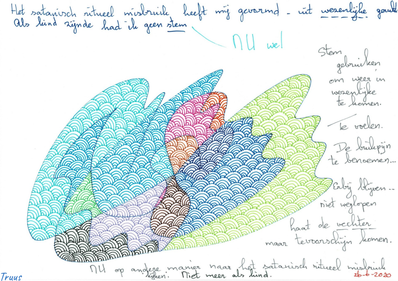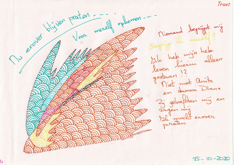 Als Truus erover wilde praten luisterde men niet, terwijl zij alleen maar gehoord wil worden over wat zij heeft meegemaakt en zo ook het kunnen verwerken. Reguliere therapeuten kunnen 't niet aan, dat antwoord kreeg en krijg Truus helaas te horen. Gelukkig gaat het steeds beter met Truus, maar de trauma's zijn enorm waar ze nog dagelijks mee te maken heeft, kracht heeft zij anders had zij het niet overleefd!!
