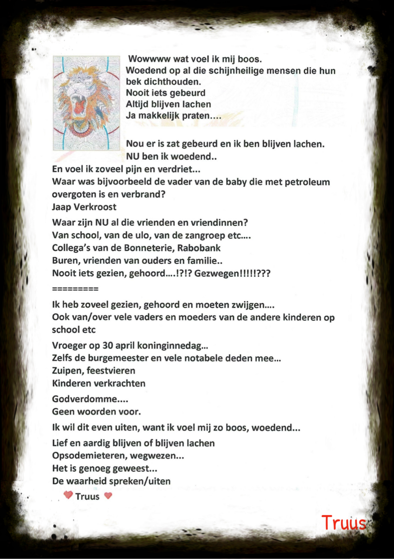 mijn baby, een meisje (ik heb haar Rozemarijn genoemd) is door mijn vader en moeder overgoten met petroleum en verbrand